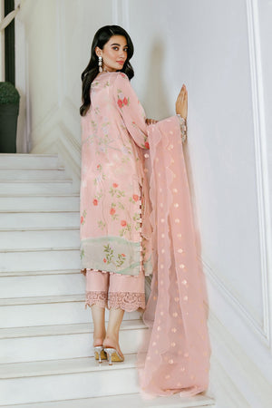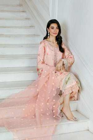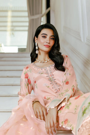 Introducing our exquisite Peachy Pink Printed ensemble from our Eid Festive Collection. The shirt, crafted from luxurious raw silk fabric, features intricate embellishments on the neck and sleeves , adorned with Swarovski organza petals and nakshi embroidery. The meticulous stitching details add to its allure. Paired with raw silk culottes boasting a scalloped embroidered border and embroided organza dupatta. this ensemble is a perfect choice for your festive celebrations.