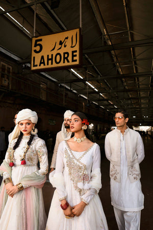 "Rukhsar Begum" ensemble from MNR's Eid Collection is sea shell white hued Pishwas in an angarkha style, delicately crafted from cotton net. Metallic bindis and embroidered motifs adorned with heavy zardozi work create an ethereal allure. The skirt features an embroidered floral border with tila thread finish, while the khadi net organza dupatta boasts gold and pink blockprinted floral details and a sprinkle of glittering accents. Paired with a Russian silk choori daar pajama, adorned with borders and kinari, this ensemble is a sublime choice for women seeking timeless elegance this Eid.