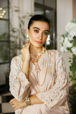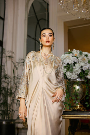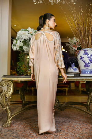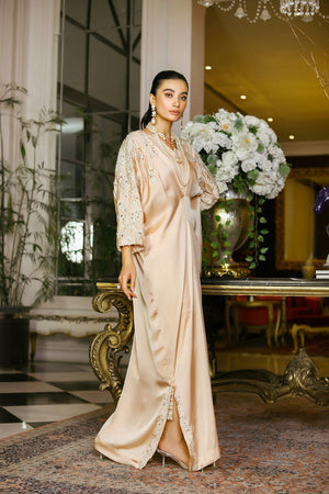 Introducing our exquisite gold shamoze Silk Kaftaan from our Eid Festive Collection. This stunning kaftan features delicate cutwork embroidery adorning the shoulders, complemented by intricate embellishments. This ensemble exudes elegance and sophistication, making it the perfect choice for your special Eid celebrations.