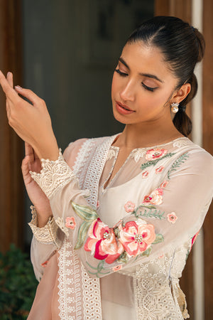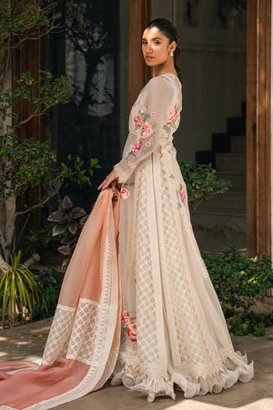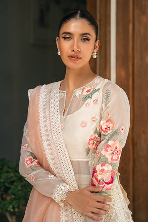 ' An ivory organza peshwas is adorned with intricately embroidered details and flower motifs. Paired with a crepe choli and a blush pink embroidered organza dupatta. Complete the look with a crushed khaddi silk lehnga.