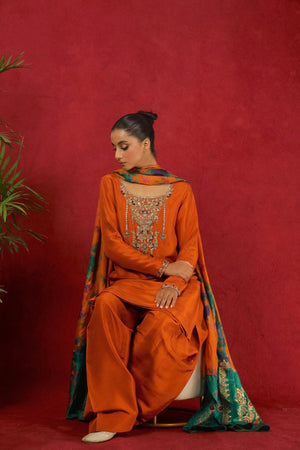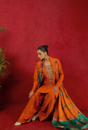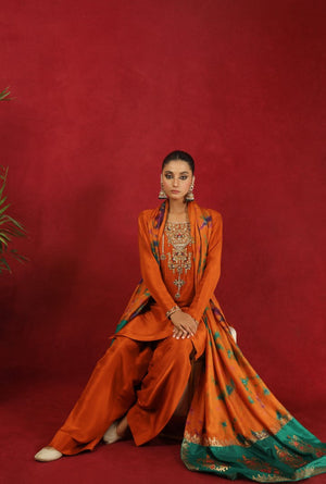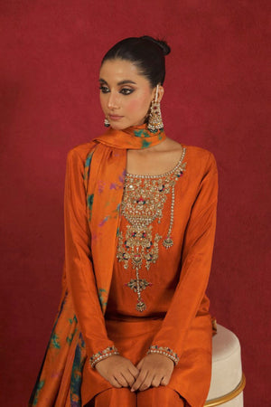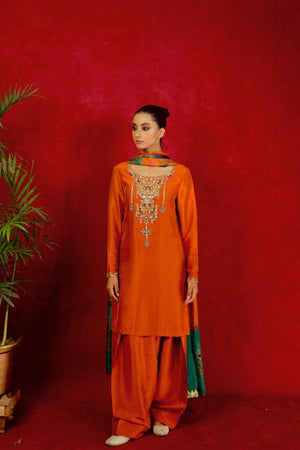 A classic rust orange shalwar kameez featuring embellished neckline and cuff; dabka, kundan, resham, tilla, nakshi & bethki is used with most meticulous care. Back of the shirt is also glistened with gold print motif. It’s paired with a multi coloured medium silk duppata with gold print and resham embroidery on pallu. Comes with a plain shalwar.