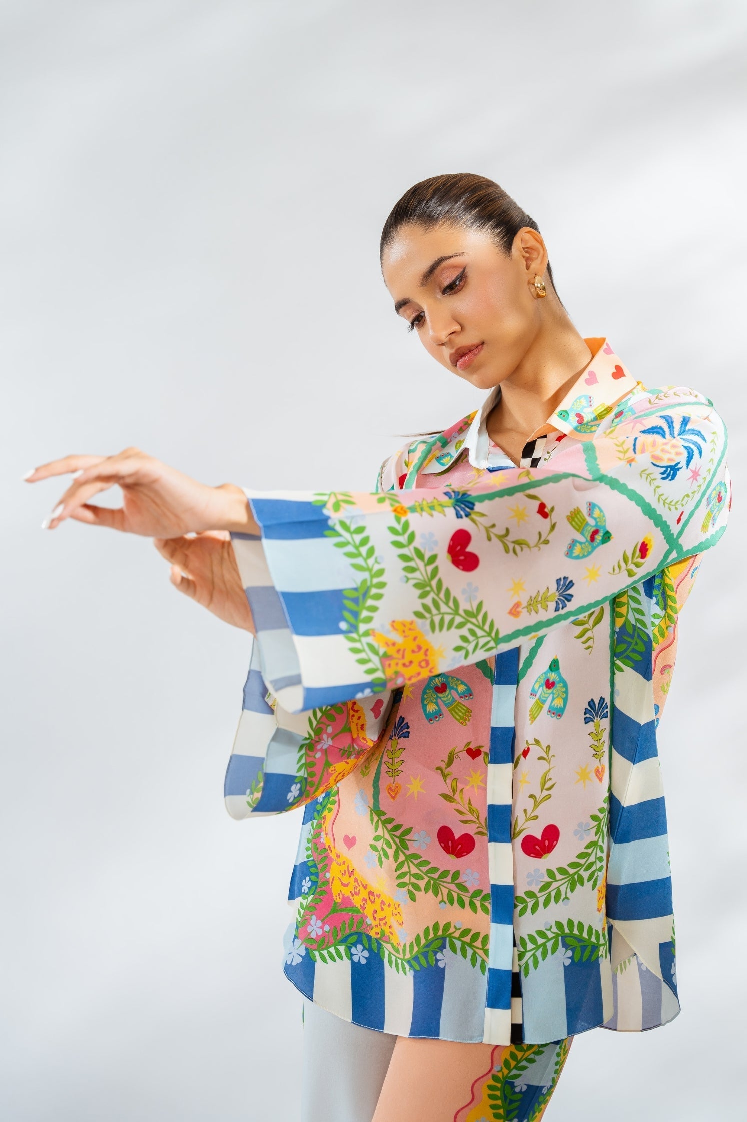 An effortless crepe co-ord set has our quintessential playful print accented with ivory and navy stripes. The powder blue and peach colour blocking mirrors the subtle beauty of mystical mornings.
