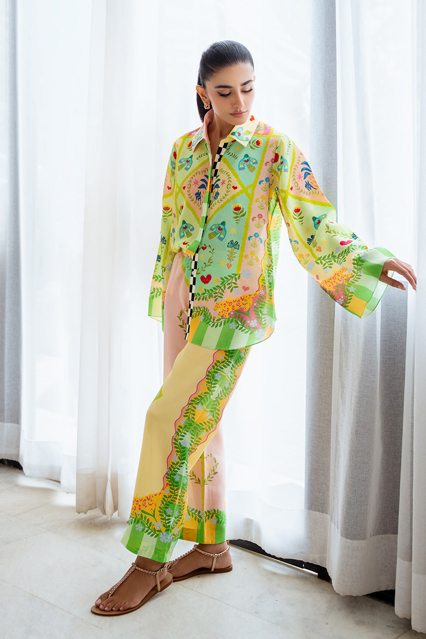 An effortless crepe co-ord set has our quintessential playful print accented with ivory and navy stripes. The lime and peach colour blocking mirrors the striking beauty of a mythical forest.
