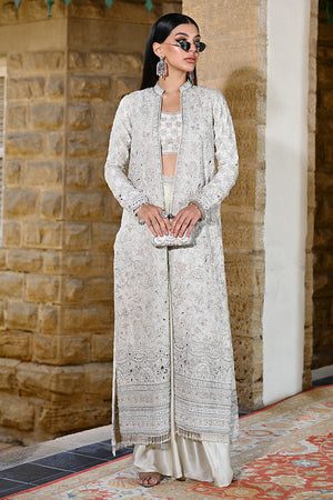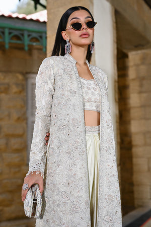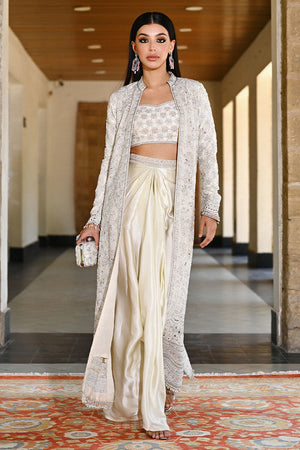 This look features a raw silk jacket adorned with intricate cutwork detailing and embellished with cutdana, Swarovski stones, crystals, and beads. Paired with a raw silk spaghetti strap bandeau and a fluid shamooz silk draped skirt, the ensemble is both modern and opulent, with a structured yet effortless finish.