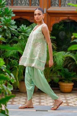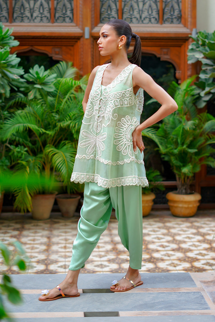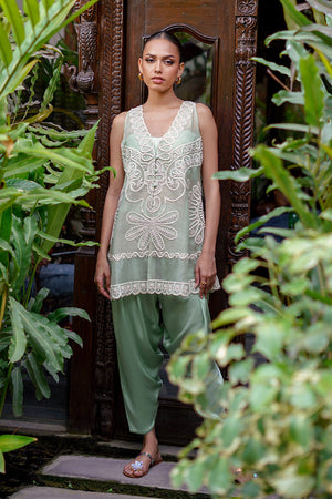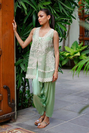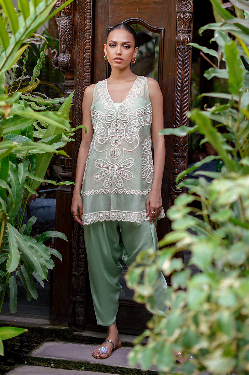 A subtlety that is irresistible. An enchanting pistachio khaddi corduroy sleeveless peplum jacket is paired with a flowing charmeuse shalwar and tube top. The monochromatic effortless ensemble showcases expert workmanship through detailed ivory resham work. Rynel is a timeless piece that can be dressed up or down.