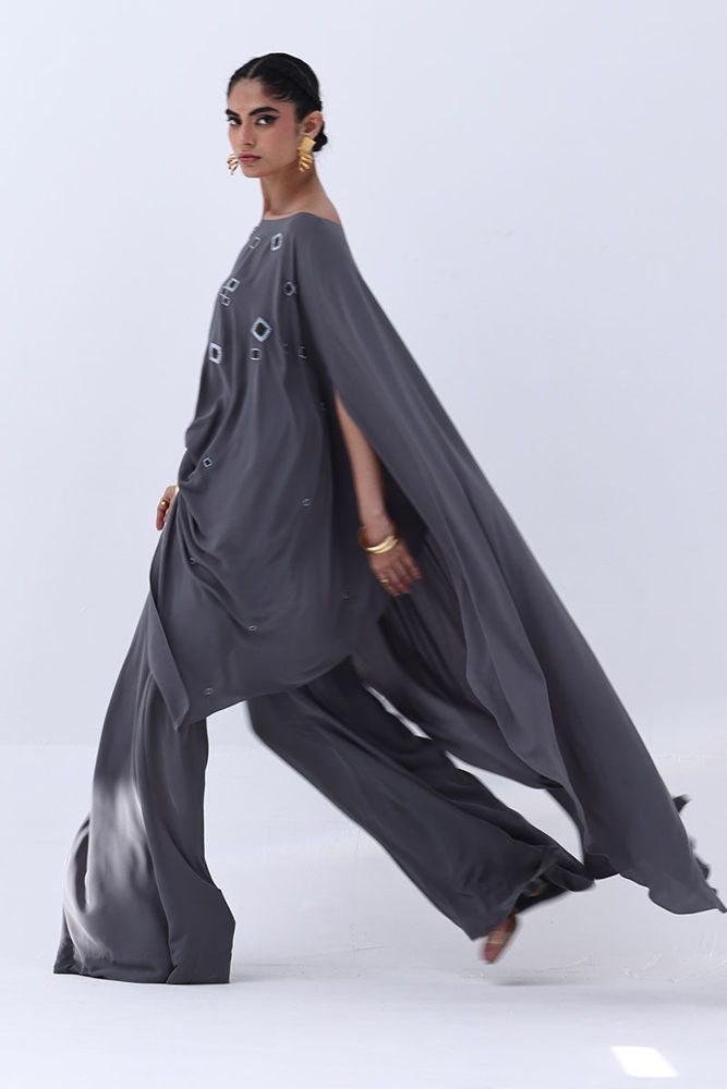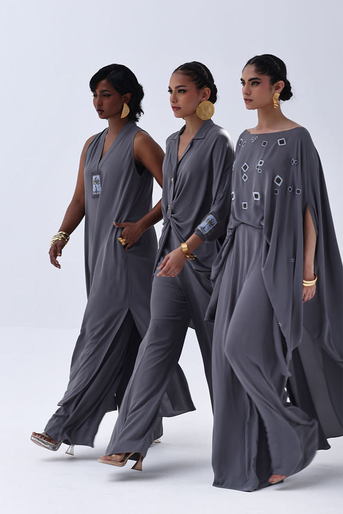 Turn heads with this sophisticated charcoal grey outfit, crafted from soft, flowy georgette fabric. The top features delicate handwork boti embroidery enhanced with subtle matte moti (pearl) embellishments, offering a refined touch of glamour. Paired with stylish culottes, this ensemble blends tradition and modern flair perfect for festive occasions, semi-formal gatherings, or evening wear.