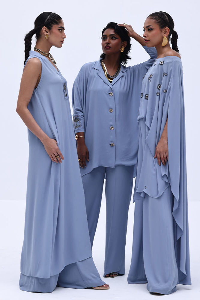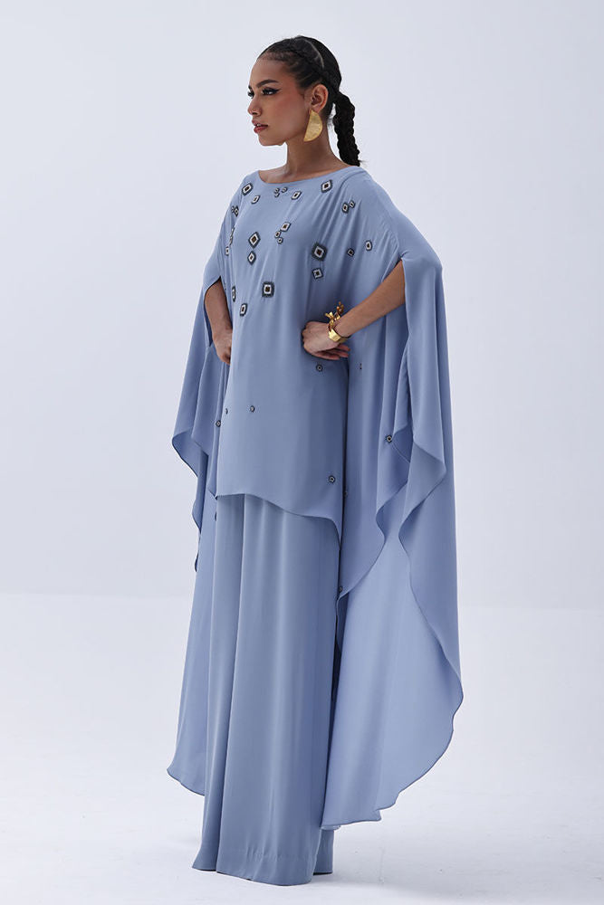 Step into elegance with this dreamy Blue Fog-colored outfit made from lightweight georgette. The top is adorned with intricate handwork boti detailing, beautifully complemented by matte moti (pearl) embellishments that add a soft shimmer. Paired with modern culottes, this ensemble strikes the perfect balance between traditional charm and contemporary style.