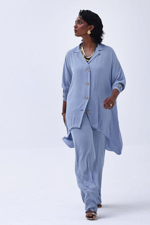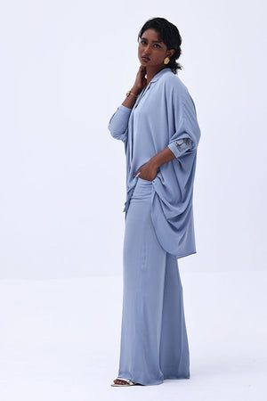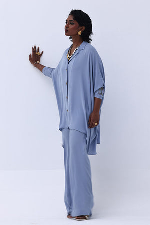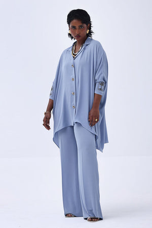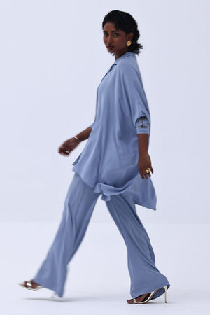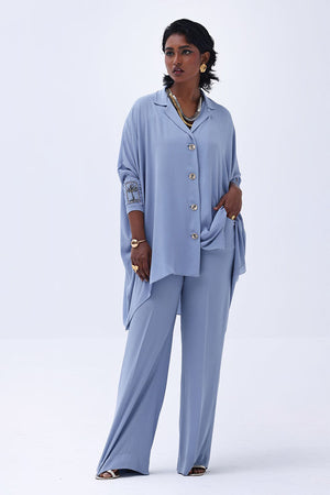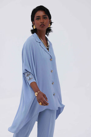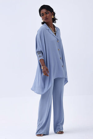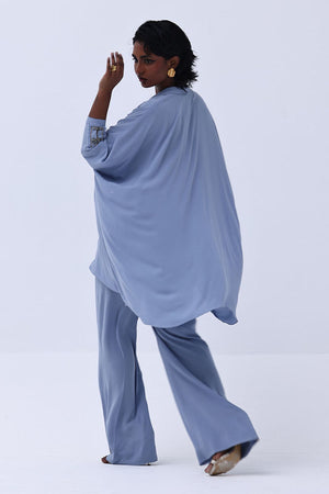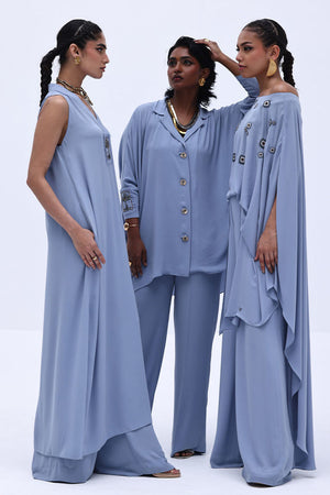 Grace meets craftsmanship in this exquisite Blue Fog Georgette piece, featuring delicate hand-made bunch detailing on both sleeves. Embellished with shimmering gold and varying shades of grey Cut Dana work, this design brings understated glamour and intricate artistry together. The lightweight georgette fabric drapes beautifully, making it perfect for refined festive gatherings