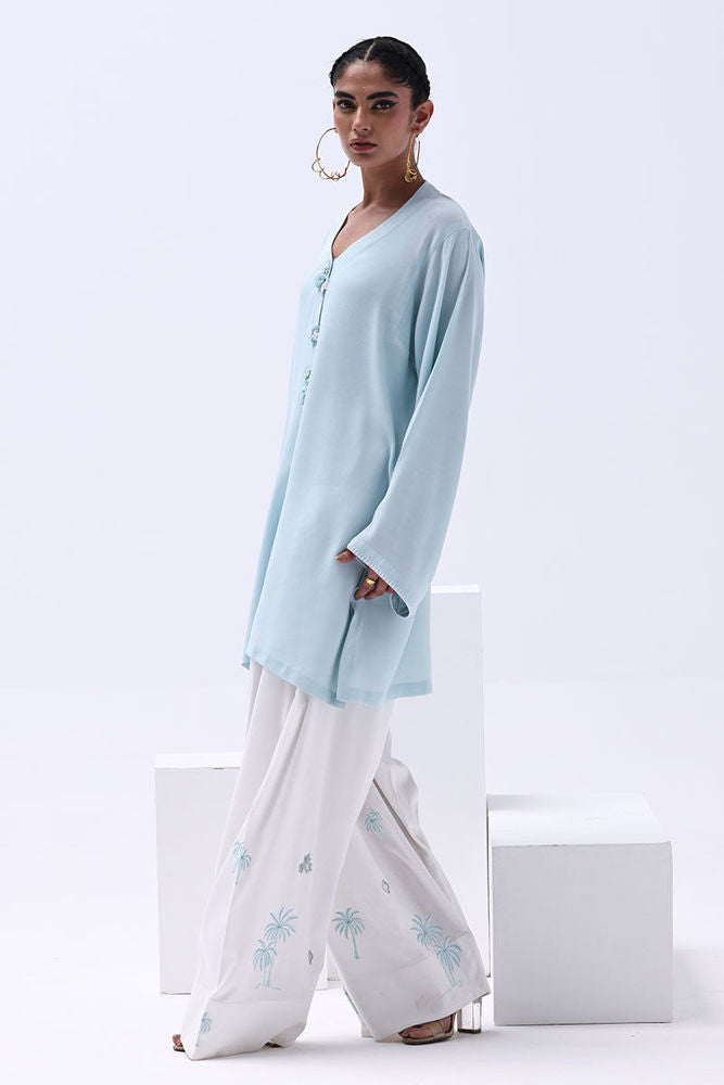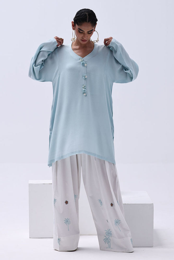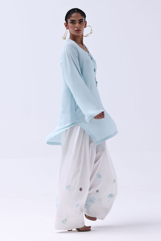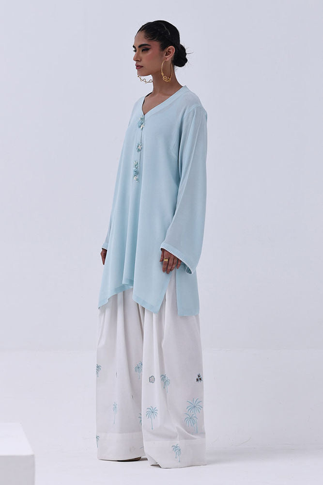 A soft symphony of tones and textures, this elegant ensemble features a Pastel Blue Turkish Linen shirt paired with an Ivory Irish shalwar. The neckline is intricately adorned with handcrafted floral detailing, including pearls, shells, sequins, moti, and 3D flowers, creating a stunning focal point of artisanal beauty. The shalwar showcases delicate resham embroidery with cutwork, adding depth and refinement to the overall look.