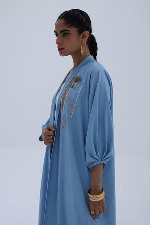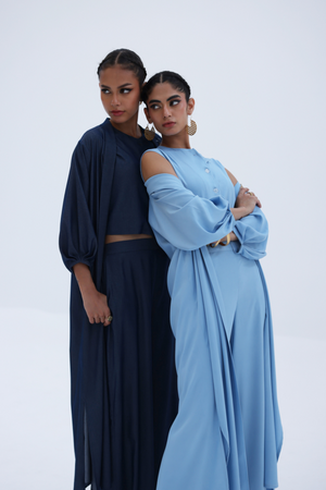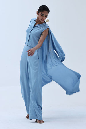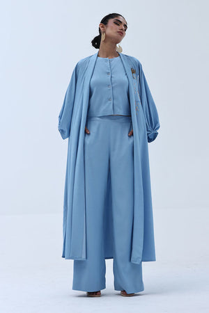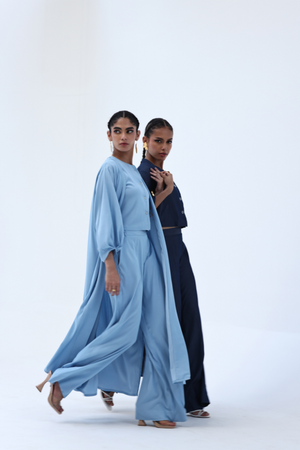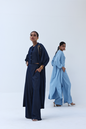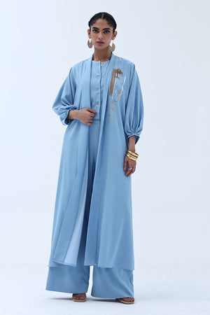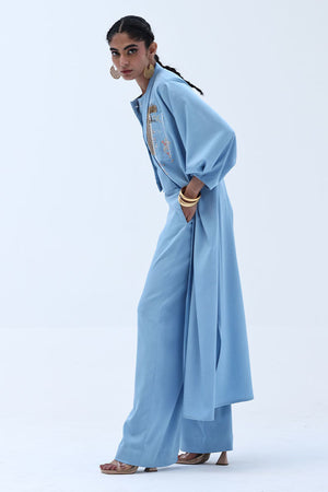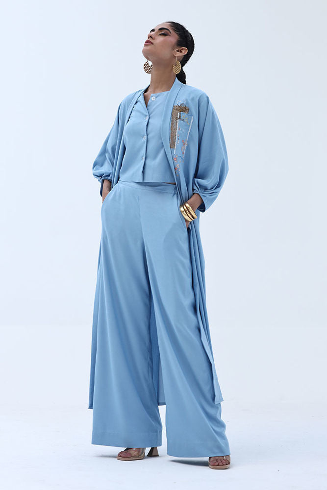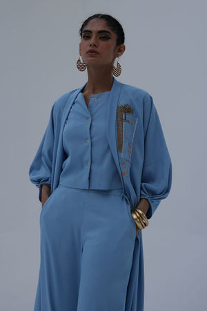 Artisanal flair meets modern design in this Dream Blue Tencil Denim ensemble. The button-down jacket is the centerpiece, featuring a striking handcrafted bunch crafted with jute, denim, zari, and vibrant Resham embroidery, adding depth and texture to the look. Paired with a clean inner top and matching culottes, this three-piece set blends structure with statement-making detail ideal for stylish daywear or contemporary festive dressing.