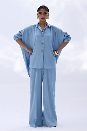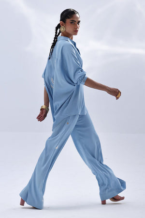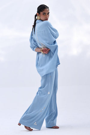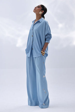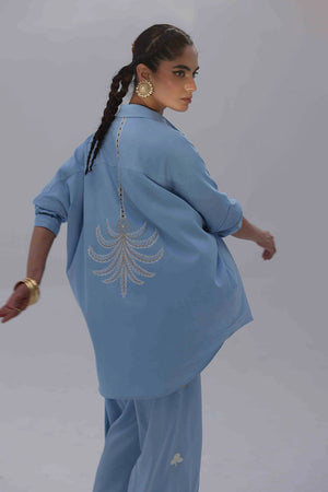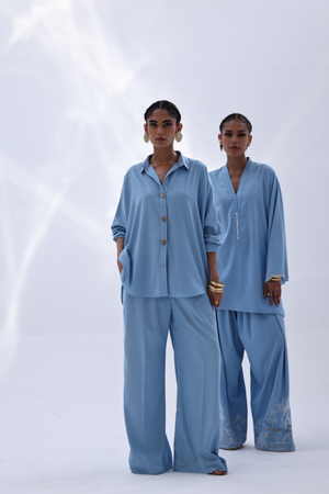 This Dream Blue Tencil Denim co-ord features a relaxed shirt with Resham embroidery and subtle cutwork on the back, offering a refined detail without overpowering the look. It's paired with coordinated culottes, finished with Resham embroidery on both sides, adding a balanced touch of texture. An easygoing yet polished outfit—ideal for everyday wear, lunch meetups, or casual office settings.