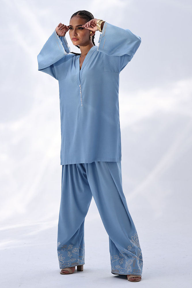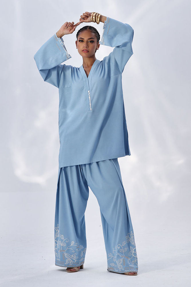 This Dream Blue Tencil Denim kurta features Resham embroidery on the sleeves and handmade patti work on the neckline, combining subtle detailing with a modern cut. It’s paired with a matching shalwar, finished with Resham embroidery at the bottom. Comfortable yet elevated, this set is perfect for everyday wear with a touch of handcrafted charm.