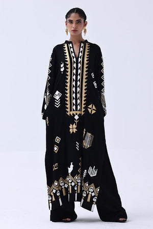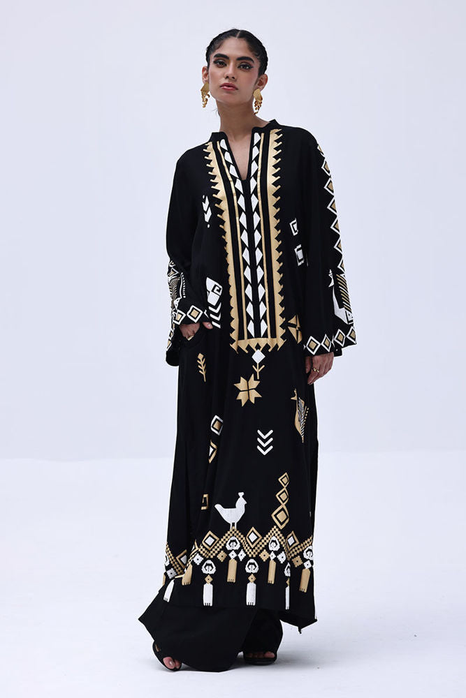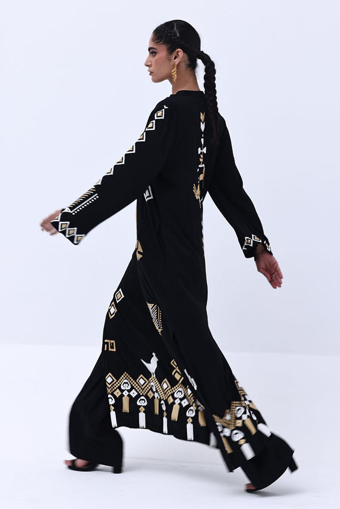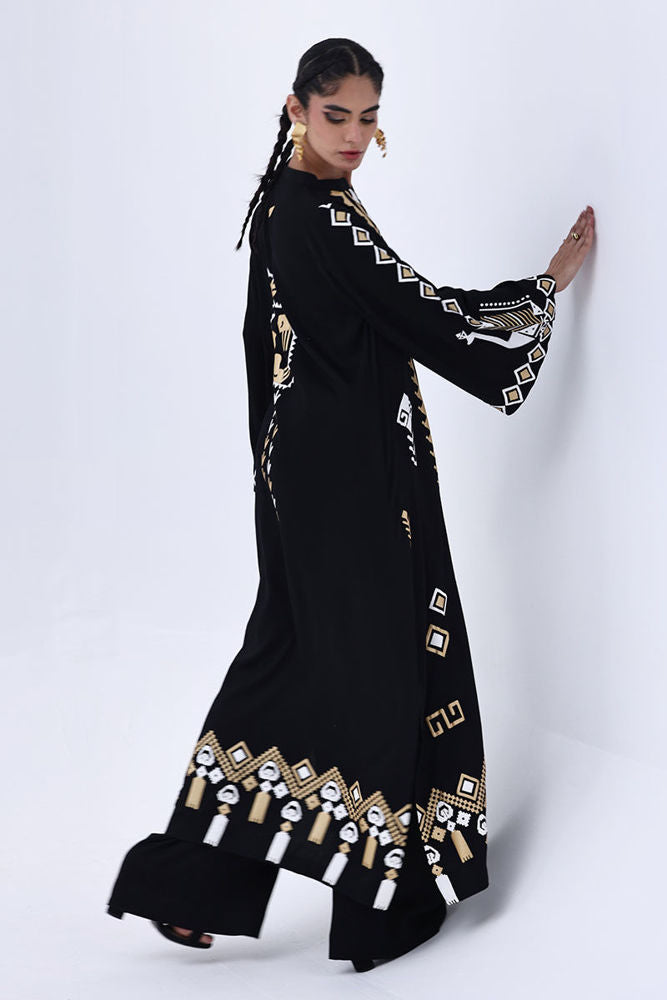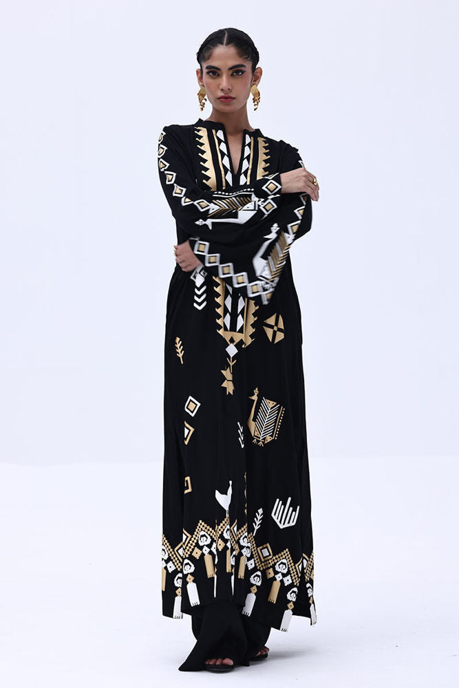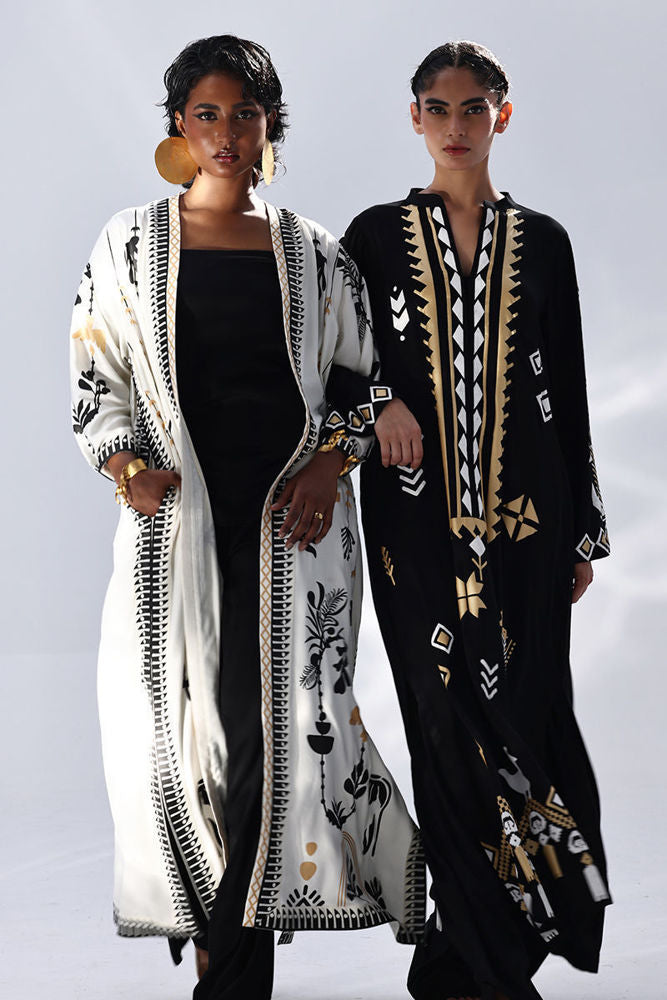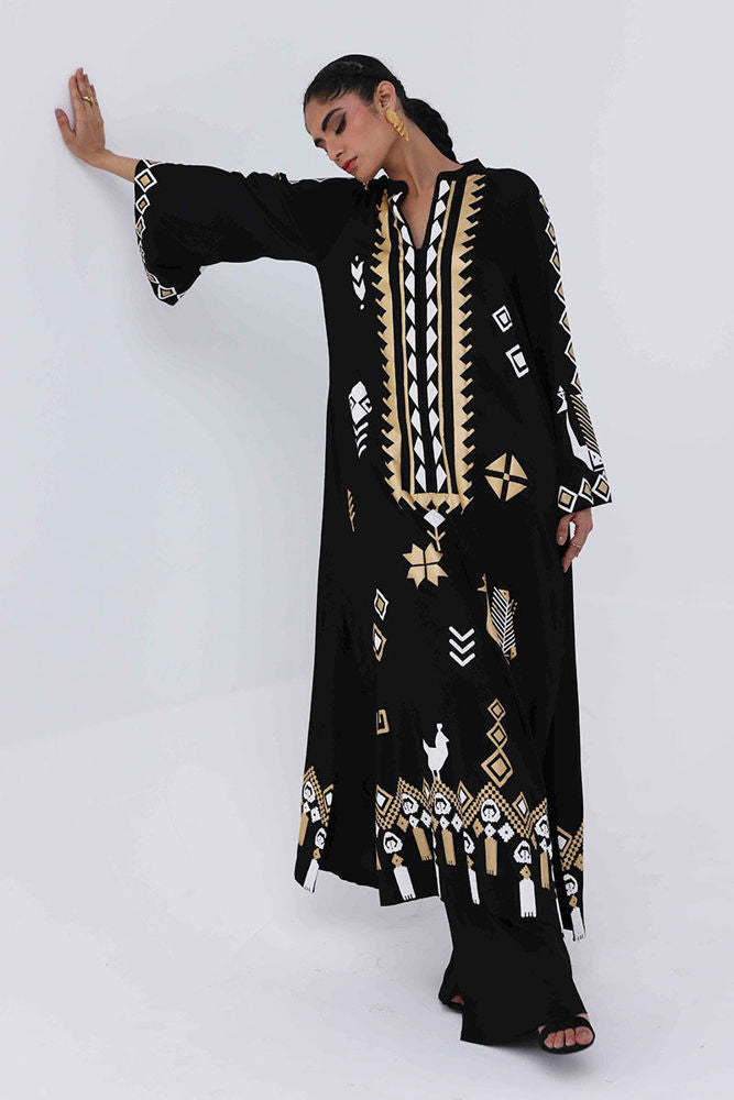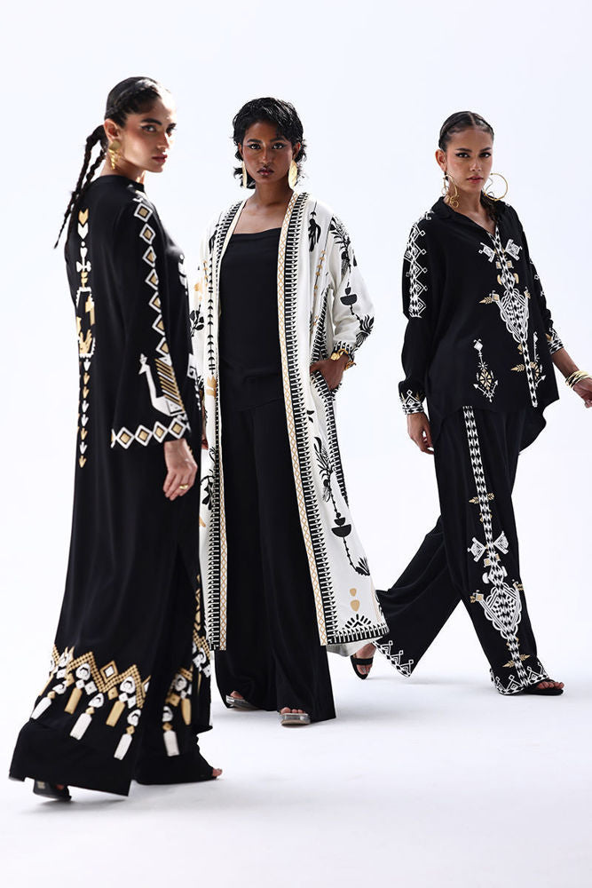Crafted from soft, breathable Rayon Silk, this black shirt and culottes set features an all-over white and gold screen print, offering a balanced blend of bold contrast and subtle shine. The coordinated culottes maintain a clean silhouette, making this an easy, go-to option for relaxed yet put-together daywear.
