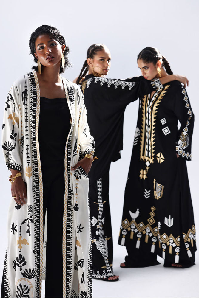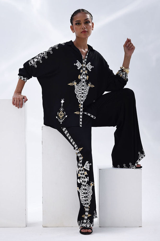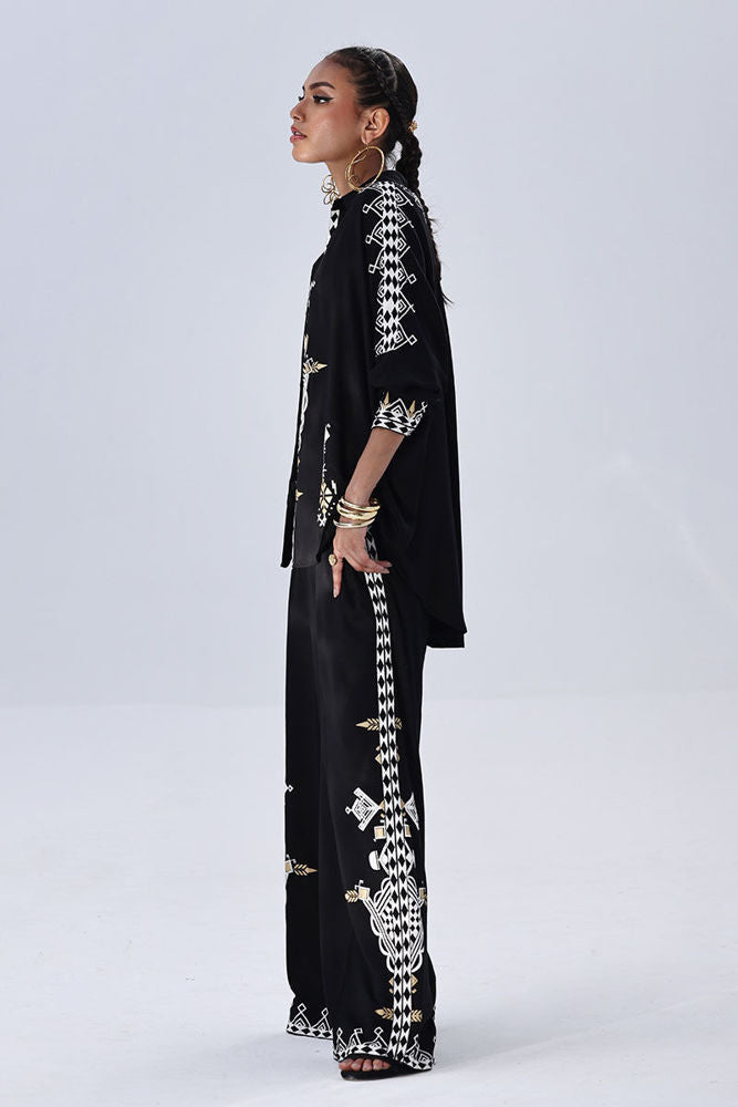 This Black Rayon Silk co-ord set features a top with all-over white and gold screen print, offering a modern contrast with a subtle touch of shine. Paired with matching culottes, the set brings together comfort and style perfect for casual meetups, office wear, or laid-back evenings.