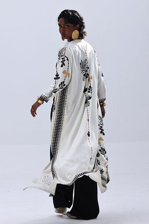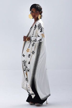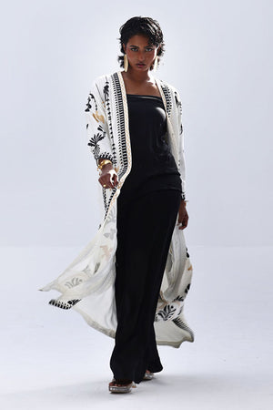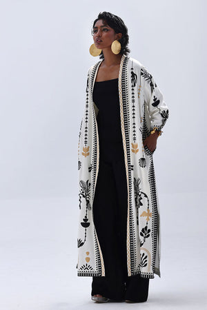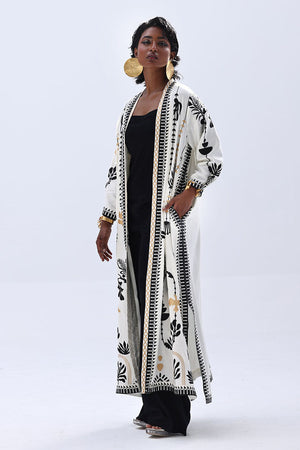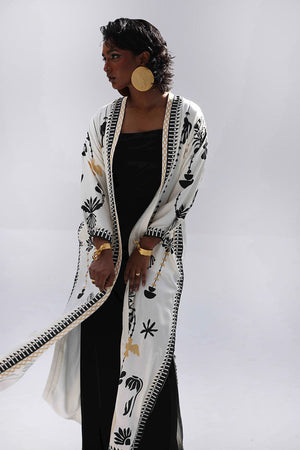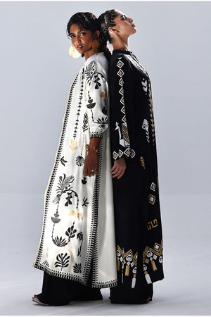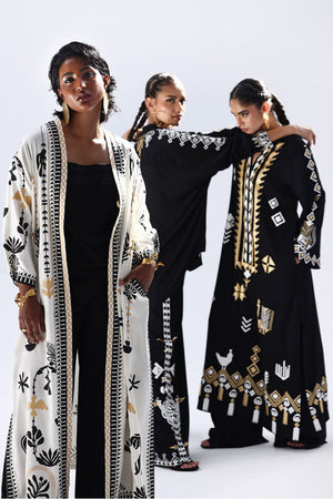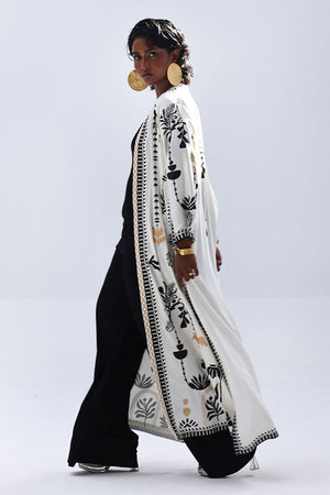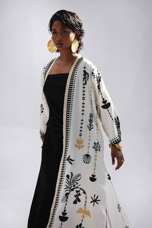 A stylish contrast of tones and textures, this set features a Vanilla Ice jacket layered over a black inner and culottes, all crafted in Rayon Silk. The inner and culottes are finished with an all-over black and gold screen print, adding subtle shine and depth. This three-piece ensemble blends elegance with ease—perfect for smart casual looks or elevated everyday wear.