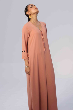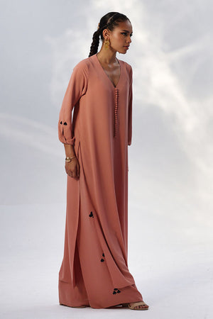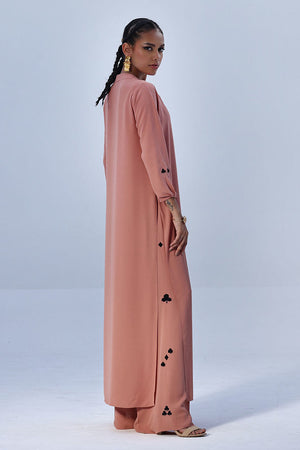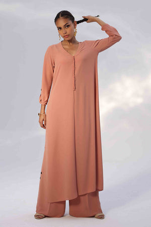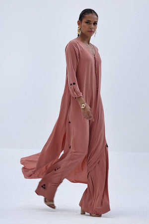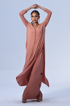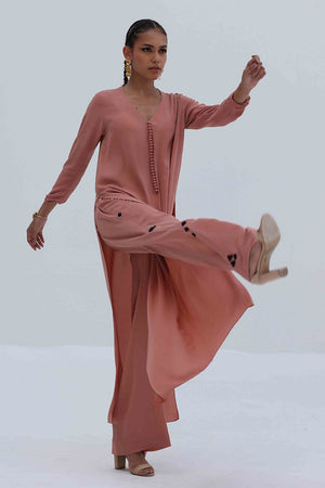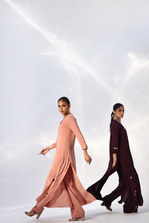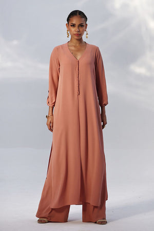 This Melted Clay Georgette outfit features a lightweight shirt with Resham embroidery on the sleeves, adding a refined touch to its fluid silhouette. Paired with matching culottes, detailed with Resham embroidery along both sides, the set offers effortless style with subtle craftsmanship.