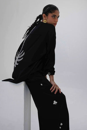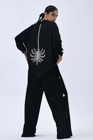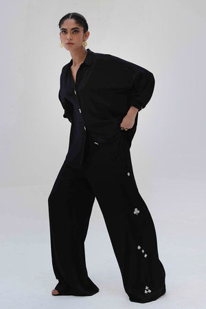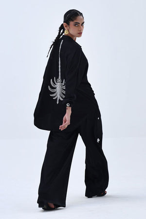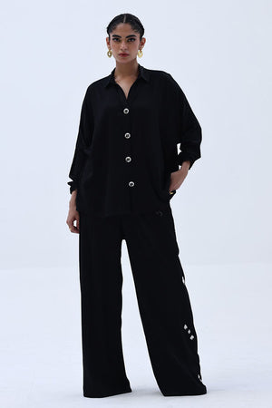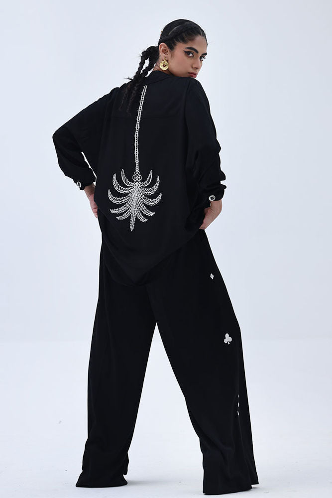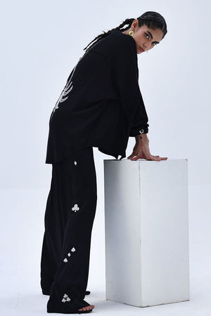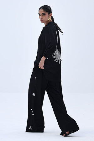 This Black Rayon Silk co-ord features a lightweight top with Resham embroidery and delicate cutwork on the back, offering an elegant surprise from behind. The matching culottes are detailed with Resham embroidery on both sides, creating a balanced, cohesive look. A versatile choice for elevated everyday wear with a touch of refined detailing.