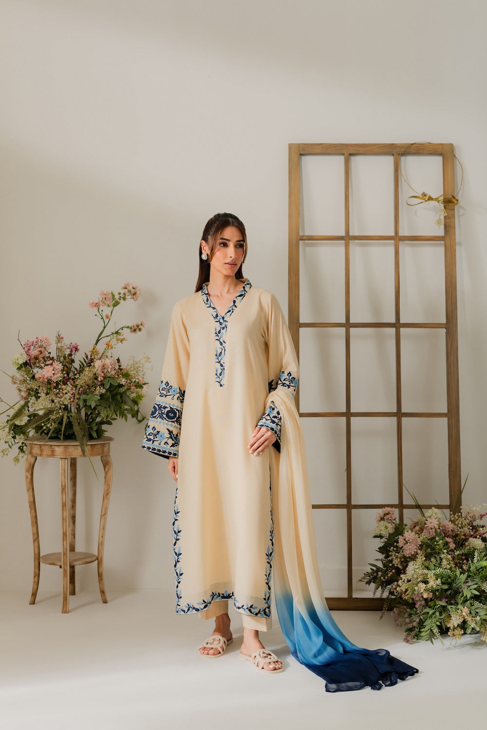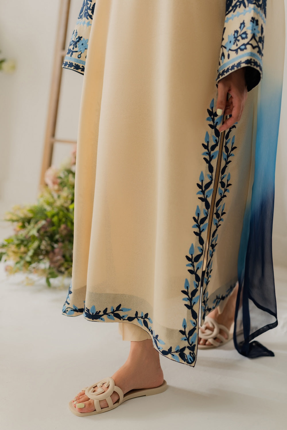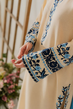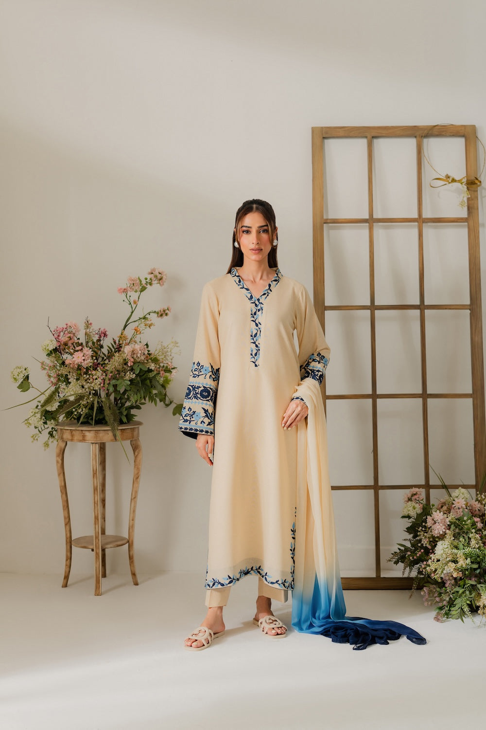 This timeless off-white two-piece karandi outfit exudes elegance with its exquisite hand aari embroidery meticulously crafted across the front, back, and sleeves. The embroidery features graceful patterns in shades of blue, offering a soft yet striking contrast against the warm off-white base. The rich texture of karandi fabric adds depth and sophistication, making it ideal for both day and evening wear. The ensemble's refined charm is beautifully complemented by a three-toned dupatta, available separately, adding a vibrant finish to this graceful and versatile look.