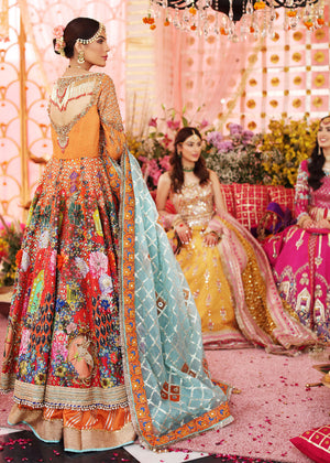 Digital printed heavily emballished pishwas is perfect to wear on your mehndi day. This ensemble is inspired by the celestial hues with hand work beads, sequance & stunning pearls. Raw silk lehngha & patch work organza dupatta completed this swoon worthy look.