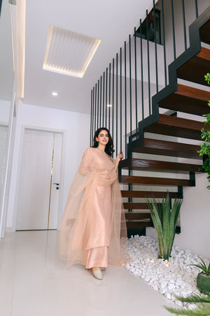 A blush pink features a gorgeous pure raw silk fabric cut perfectly into a beautiful mid length shirt embellished with intricate hand made embroided boti with three quarter puff sleeves. Paired with blush pink pure raw silk shalwar and alluring organza dubata with hand embroided exquisite boti spray.