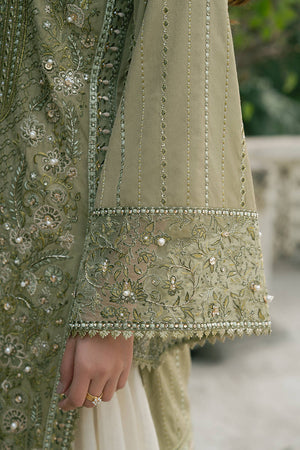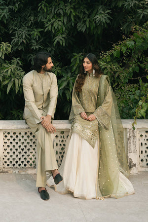 A cotton net shirt in a rich olive green shade, intricately embroidered with floral lattice patterns across the body, framed by scrollwork on the collar and neckline, further enriched with beads and embellishments. A jute sharara in a soft cream tone, finished with embroidered borders, adds grandeur. The tie-dye gradient organza dupatta, dusted with sequins, brings a subtle shimmer. A statement ensemble for a celebratory Eid dinner.