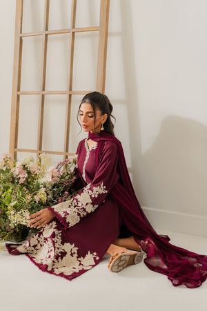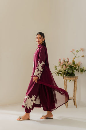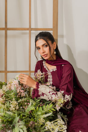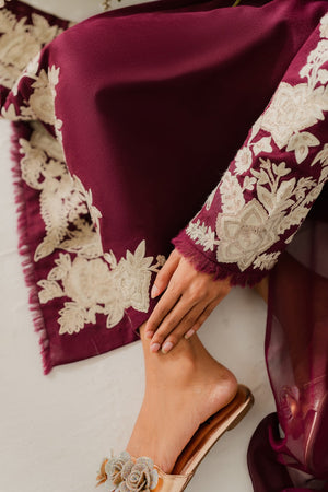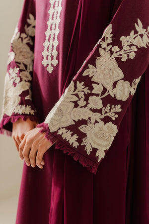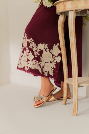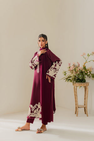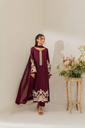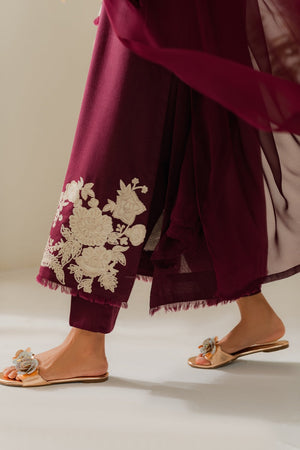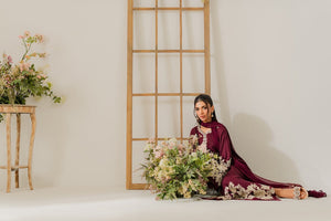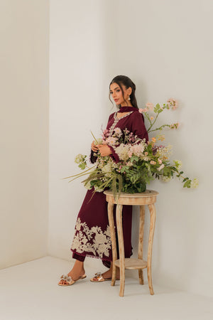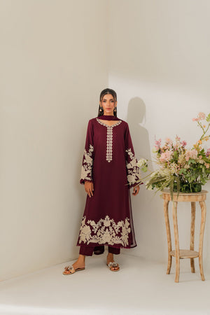 This rich burgundy two-piece karandi outfit is a refined blend of elegance and traditional artistry. The shirt features exquisite hand aari embroidery thoughtfully placed along the daaman, sleeves, and neckline, creating a beautifully balanced design that draws attention to the finer details. The intricate threadwork stands out against the deep burgundy base, while the textured karandi fabric lends a warm, structured drape ideal for the fall season and formal settings. A matching dupatta is available separately, offering the perfect finishing touch to this graceful ensemble.