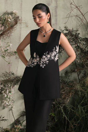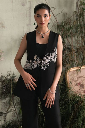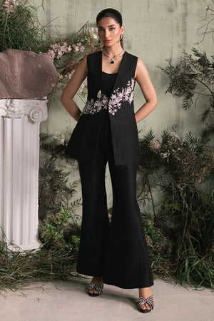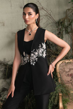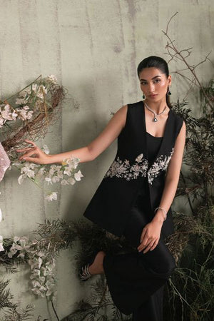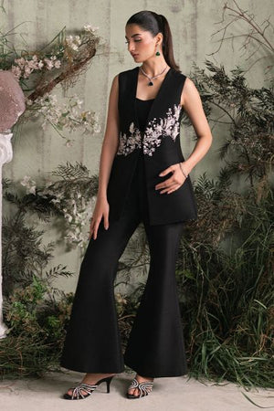 Make a stunning statement with this exquisite black jacket, expertly crafted with a sleek front opening and short silhouette. The jacket's dramatic allure is elevated by intricate 3D organza floral work, meticulously handmade and embellished with luminous white pearls. Paired with flowing bell-bottom pants, this ensemble exudes elegance and sophistication. The perfect blend of modern chic and timeless craftsmanship, this outfit is ideal for special occasions, formal events, or anyone seeking to make a fashion-forward impression.