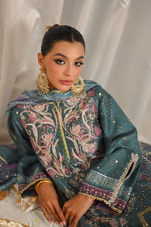 A stunning teal digitally printed long shirt, known as a chunri, featuring intricate embellishments on the neckline, daman borders, and slitted sleeves. Exquisitely embroidered tassels adorn the side seams, adding a touch of elegance. The ensemble is complemented by a block-printed raw silk izaar with a printed borde, and a dupatta adorned with embellishments and gota work.