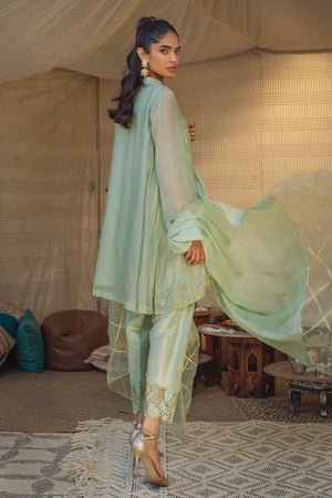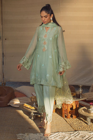 This stunning sage green outfit features a short panelled pure cotton net shirt that is both elegant and stylish. The shirt boasts beautiful cut work embroidery on the sleeves and scattered embroidered motifs on the shirt. The embellished neckline adds a touch of glamour and sophistication to the overall look. The outfit is completed with a medium silk dupatta featuring organza and gold detailing, adding a touch of luxury and elegance to the ensemble. Paired with a khari shalwar that features cutwork embroidery, creating a cohesive and stylish look. The sage green colour is both timeless and refreshing, making this ensemble a standout choice for any event.