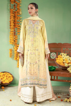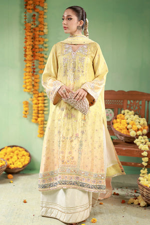 Designed with a long kurta and 4-panel dhaka pants featuring block print and dhanak on the hem. The fitted sleeves and round V neckline are balanced with embroidery in gold kaam, cutdana, moti, sitara, pearls, and tiki stones. Paired with an ombré medium silk dupatta with scattered chan.