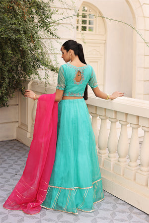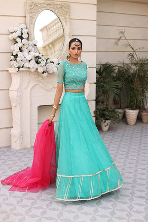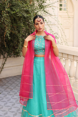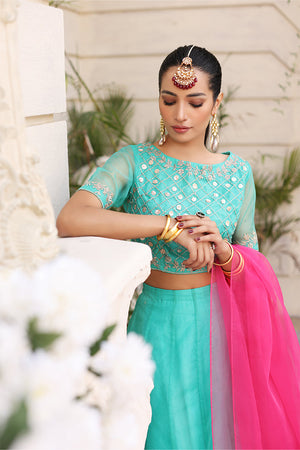 Carry this colour with confidance this embroidered organza choli is enhanced with gotta work. Its paired with organza lengha with gotta border & shoking pink organza dupatta.