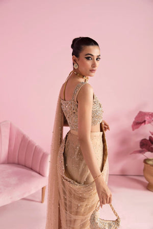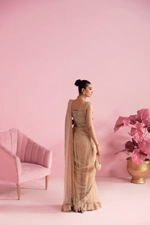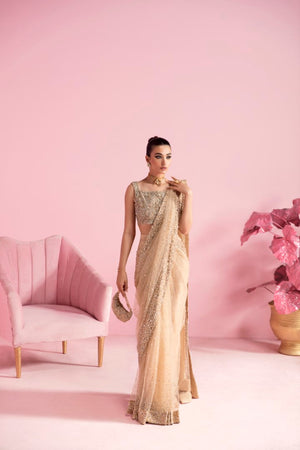Steal the spotlight with this breathtaking nude net saree that exudes sheer elegance and sophistication. Every inch of this saree is adorned with an intricate and delicate pattern of shimmering pearls and sequins, creating a mesmerizing and eye-catching effect. The blouse that accompanies it is made of pure raw silk, intricately embellished with different techniques that perfectly complements the saree. The embroidery features a mix of traditional and contemporary patterns, creating a beautiful and organic flow.