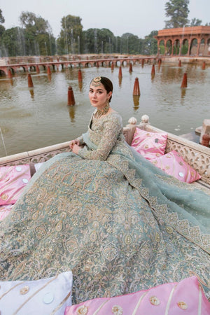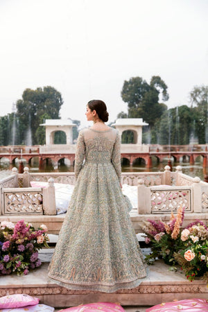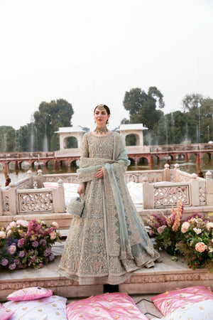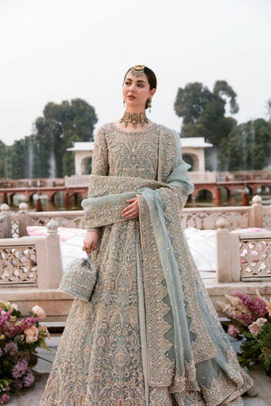 A chic and feminine couture look, Saleha consists of ice blue hued organza gown, bejeweled with naqshi, dabka, crystals, pearls, and sequins. Paired with self jamavar lehanga, with embellishment on the border. The outfit is paired with heavily embellished organza dupatta with all around border and center spray of motifs and pearls.Gown: Organza