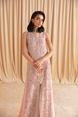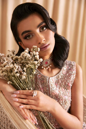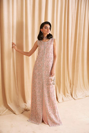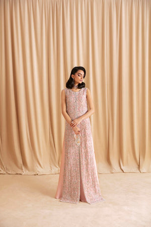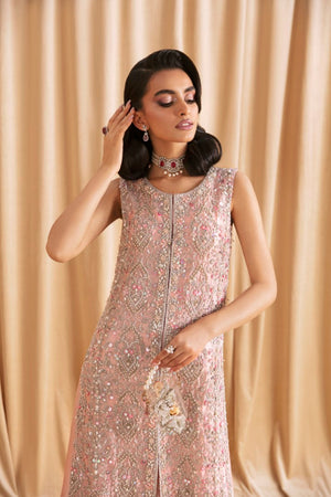 Salina' is a delicately made subtle pink front open long shirt with gold tilla embroidered base and intricate hand- embellishments. It elaborate embellishments, which include exquisite stitching and sequins that shine and catch the light to create a mesmerizing effect, are a true piece of art. This outfit is paired with flair silk pants in the same color, perfect for formal occasions. The intricate embellishment adorning the dress are a true work of art, featuring delicate embellishment sequins and embroidery, which shimmer and catch the light creating a captivating effect.