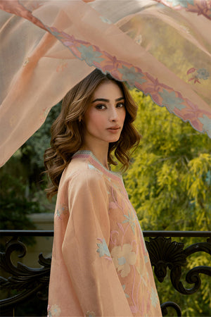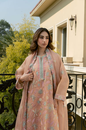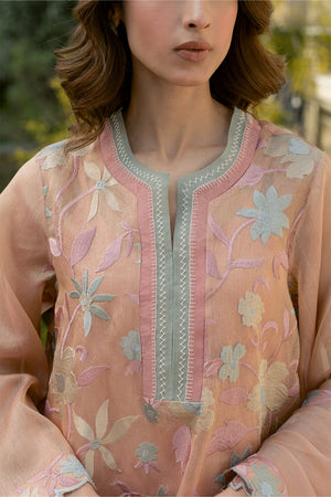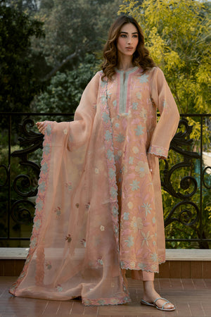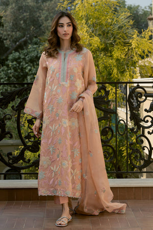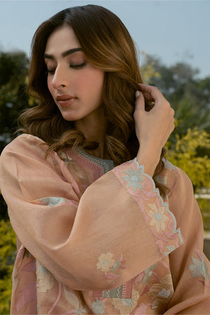 Elevate your iftar celebrations with our exquisite peach-hued organza raw silk shirt, adorned with intricate botanical embroidery in delicate pastel shades and meticulous artisanal detailing. This stunning outfit is completed with a beautifully scalloped organza dupatta and matching khaddi silk trousers, ensuring a refined and stylish presence.