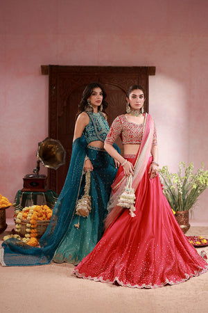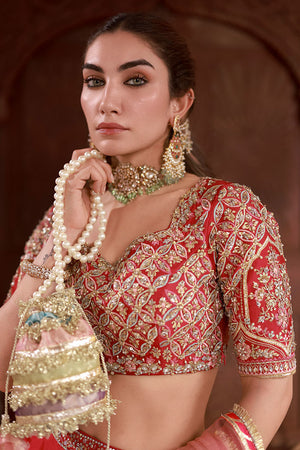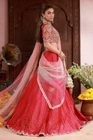 Sheesha silk lehenga choli in magenta with an all-over jaal on the choli featuring pastel resham, zardozi, gota, dabka, and sequins. Lehenga has a sequin spray and scalloped border. Paired with a three-color ombré net dupatta.