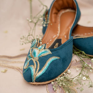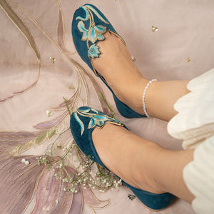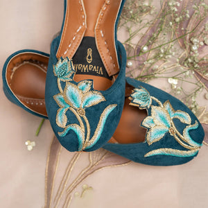Our stunning khussa showcases blooming flower designs adorned with 5 to 6 hours of handmade craftsmanship, featuring exquisite Resham, Dabka, and crystal work on luxurious velvet. The leather bottom ensures all-day comfort, making these the perfect pair for your festive wardrobe.