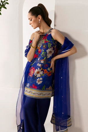 This stunning blue floral print dress features a hand-embellished neckline at both the front and back, adding an elegant touch of craftsmanship. Paired with a matching pants, adorned with intricate hand embellishments, it exudes refined style.