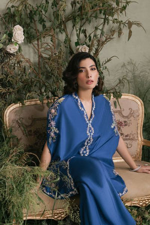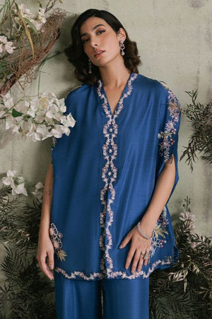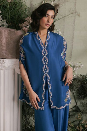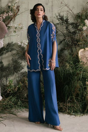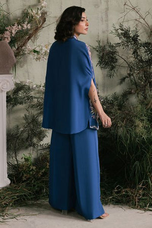 Make a majestic statement with this breathtaking teal blue Luna cape, adorned with exquisite hand embroidery and intricate flower embellishments. The cape's flowing silhouette and striking colour evoke a sense of regality, while the delicate embroidery and beading add a touch of whimsy. Paired with sleek trousers, this ensemble exudes modern elegance and sophistication. Perfect for formal events, weddings, or high-end gatherings, this outfit redefines traditional style with contemporary flair.