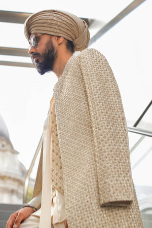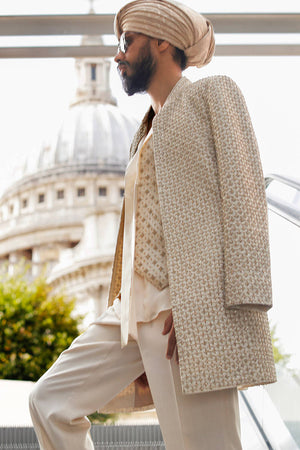 Presenting Sardar — an ensemble that effortlessly fuses tradition with western flair. The block-printed motifs are intricately accented with adda and resham embroidery, while the band collar features refined doori detailing. Layered over a pure silk shirt and paired with sleek suiting trousers, this look is perfect for the modern gentleman.