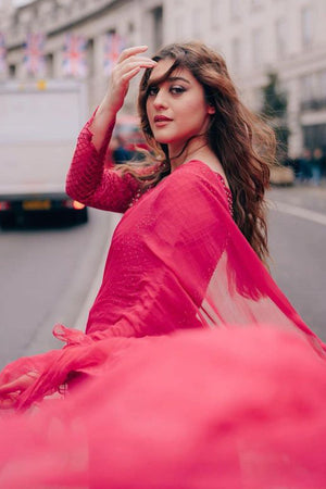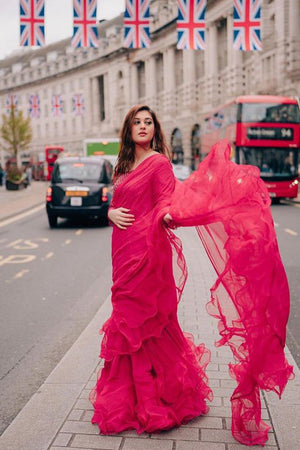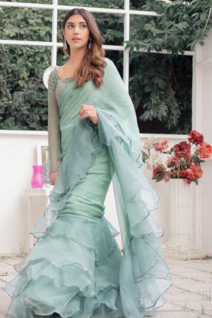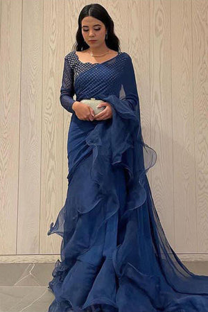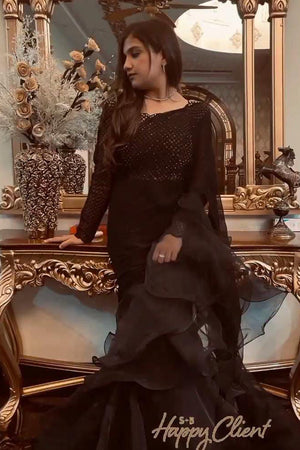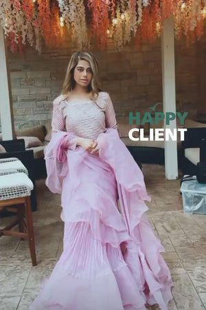 This glamorous plum chiffon saree comes with an organza blouse and raw silk lining. A scalloped neckline with gold sitara and mutli betki blended harmoniously over the self-embroidered check organza. The saree gets its unique flare with organza ruffles and cancan to give it a voluminous look. A remarkable outfit indeed ,