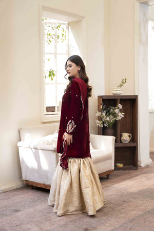 A beautiful maroon color velvet outfit has embelisshed on neckline and sleeves with gotta work and hand embroidery with stones and swarovski and crushed dupatta with gotta detailing on it. Jamawar gharara included.