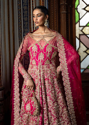 This dazzling shocking pink ensemble is a vision of grandeur, featuring a pishwas, lehenga, and dupatta, all crafted from luxurious Kathan organza. The pishwas boasts a gorgeously hand-embellished bodice with an extravagant neckline, adorned with an array of shiny ornaments including sequins, crystals, naqshi, and dabka. It is paired with a stunning lawn silk lehenga, intricately designed with a beautiful jaal pattern. Completing the look is a Kathan organza dupatta, which captivates with its mesmerizing spray of sequins, sitara, and dabka. This outfit is a perfect blend of opulent detailing and vibrant color, ensuring you make a breathtaking statement at any special occasion.