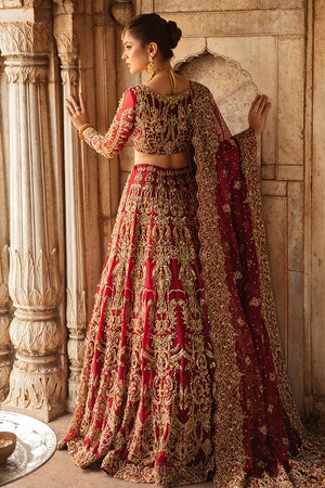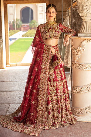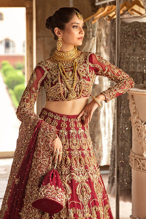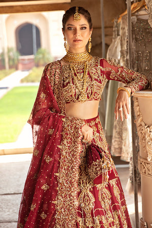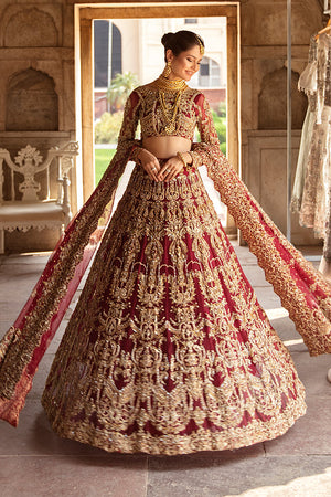 Sartaaj is a stand out look for the joyous occasion; this ensemble consists of a deep maroon hued lehnga choli. The paneled organza lehnga consists of motifs enhanced with sitara, dabka, and naqshi. The choli is fully hand worked with intricate motifs and gleaming details. The outfit is paired with an organza dupatta heavily embellished all around border, with center spray of motifs and pearls.