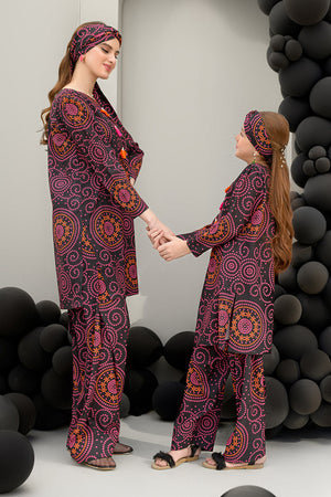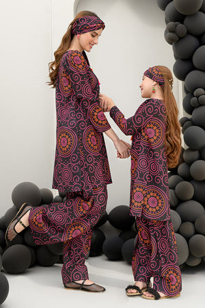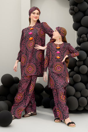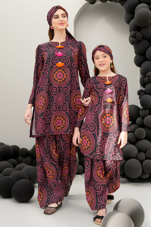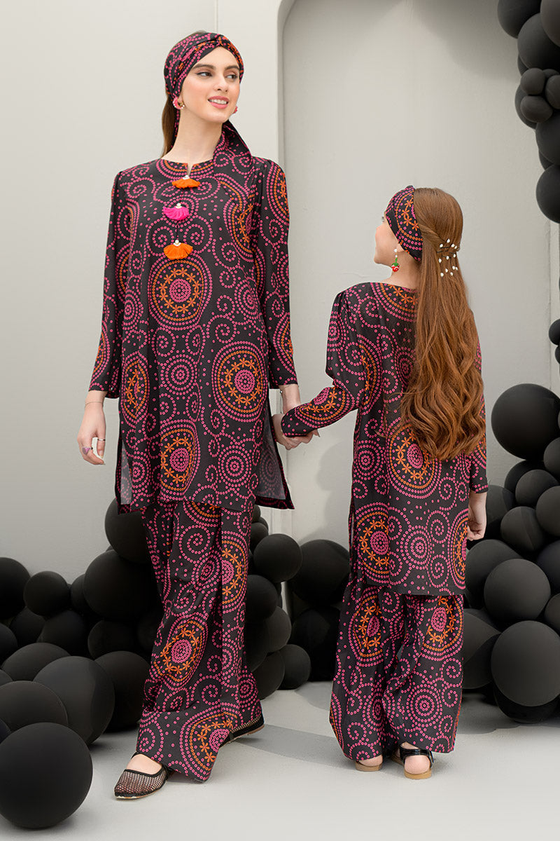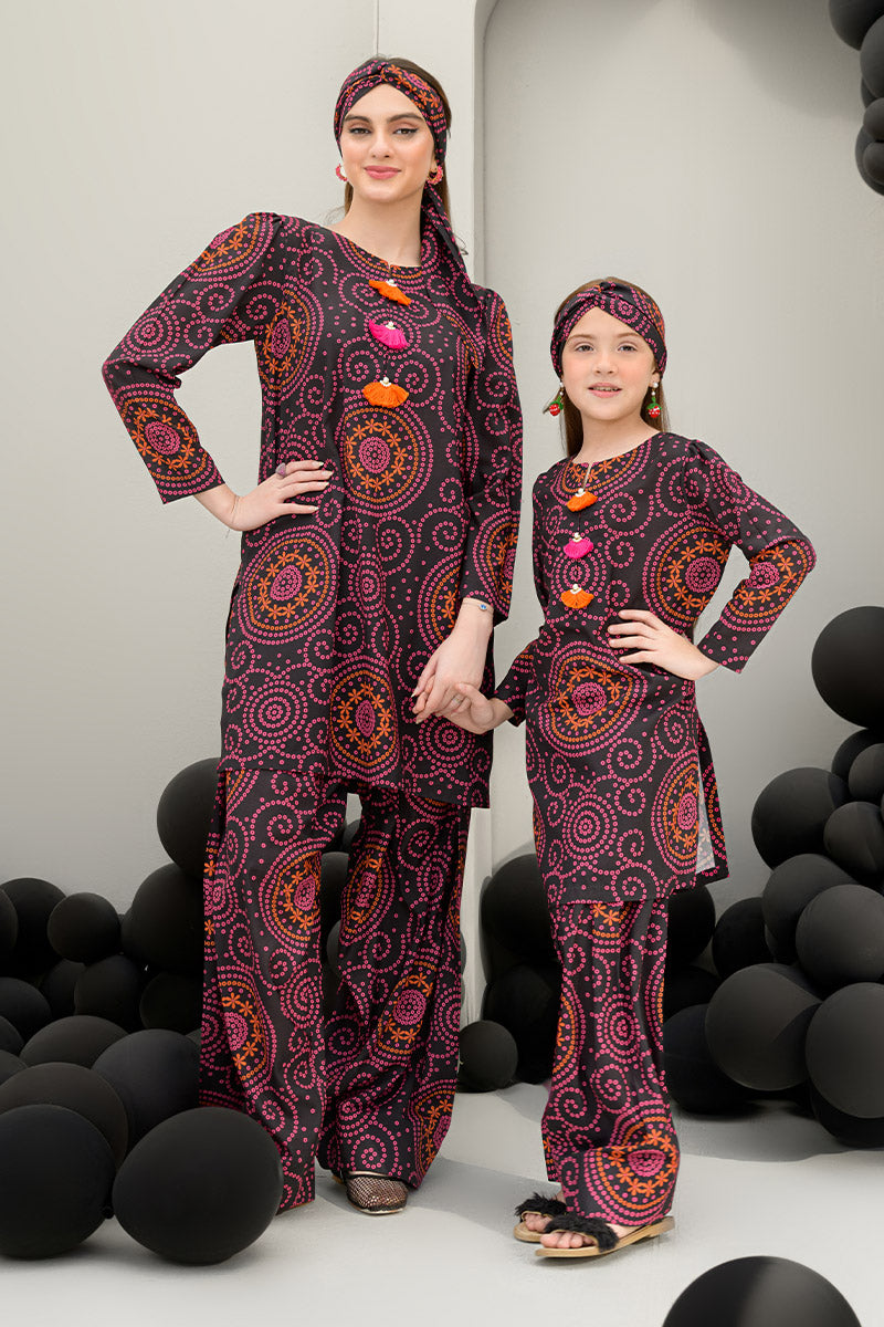Introducing the Savanna Night co-ord set, a striking ensemble designed to make a bold statement. This set features a dynamic combination of black adorned with vibrant green and orange prints, celebrating vibrant elegance. It includes a stylish short shirt paired with traditional shalwar, perfectly balancing modern chic with cultural charm. Crafted from soft crepe fabric, this set drapes beautifully, ensuring all-day comfort without compromising on style. Whether you're attending an evening event or a festive celebration, the Savanna Night co-ord set guarantees you stand out with confidence and grace. Note: Kids' lengths will be according to the size chart.
