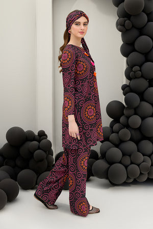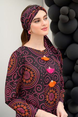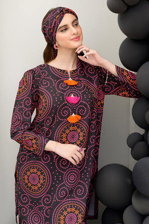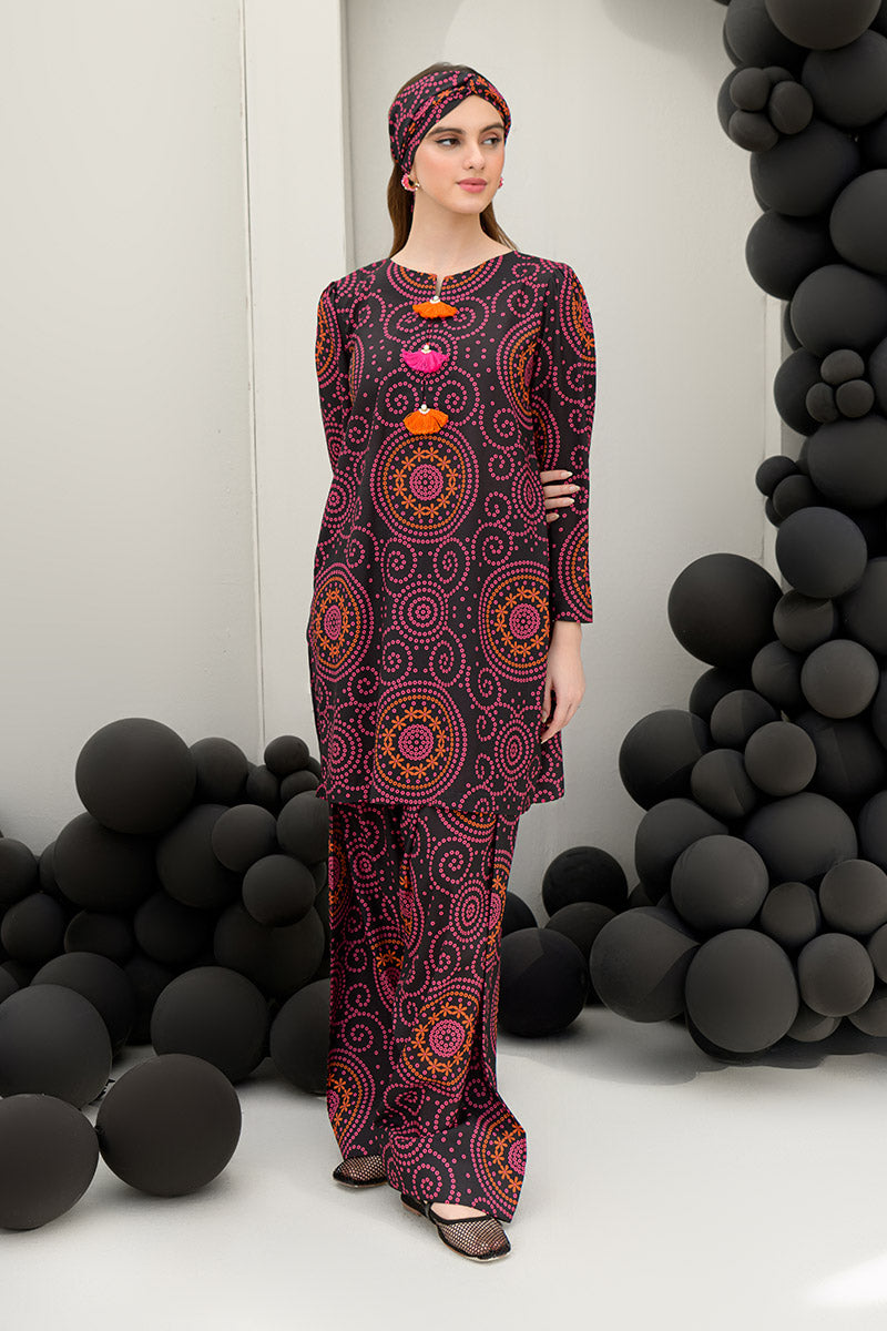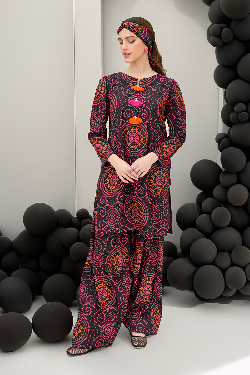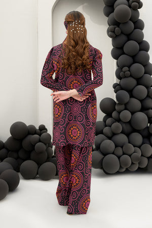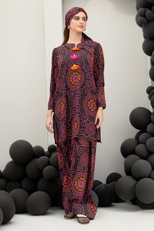 Introducing the Savanna Night co-ord set, designed to make a bold statement and celebrate vibrant elegance. This striking ensemble features a stylish short shirt in a captivating combination of black with green and orange prints, paired with a traditional shalwar. The set offers a perfect balance of modern chic and cultural charm. Crafted from soft crepe fabric, it drapes beautifully, providing all-day comfort without compromising on style. The shirt measures 35 inches in length, while the shalwar is 42 inches long, ensuring a flattering fit. Whether you’re attending an evening event or a festive celebration, the Savanna Night co-ord set ensures you stand out with confidence and grace.