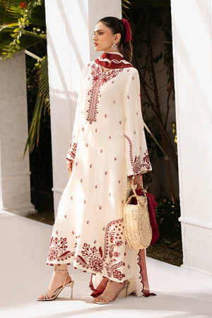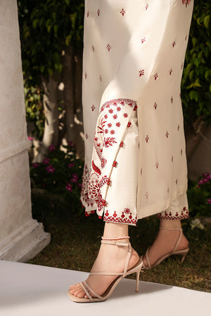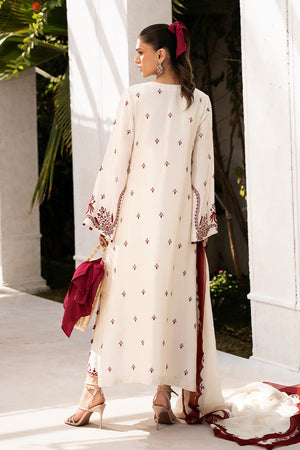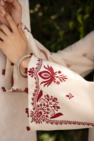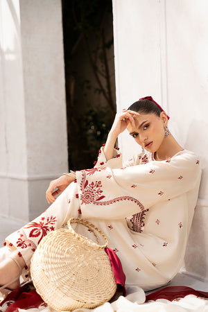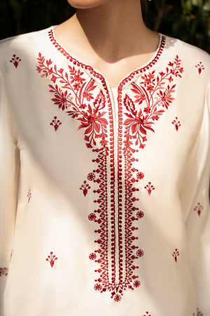 Ivory long kurta with an oversized, loose fit and wide full-length sleeves. Deep red resham thread embroidery is applied across the front and along the sleeves in floral and linear patterns. The dupatta is cut in matching ivory, finished with scalloped edges and sheer organza trimming along the border. Embroidery placement on the dupatta follows the scallop curve for consistency in design flow.