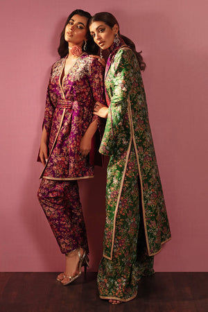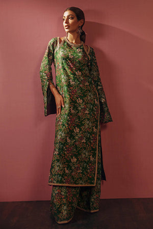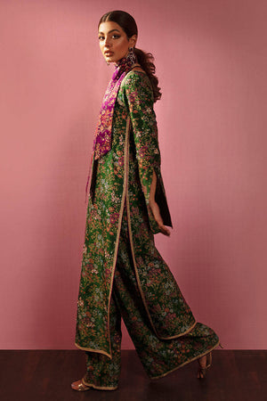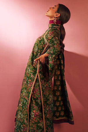 An eye-catching leaf green long printed hand embellished shirt and neckline, completed with printed pants and chiffon dupatta. Shirt Length: 50 Model Height: 5'5