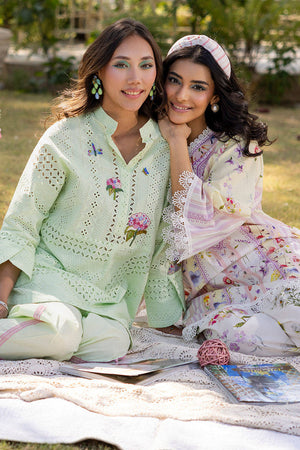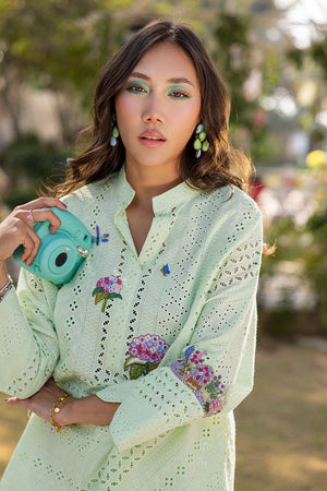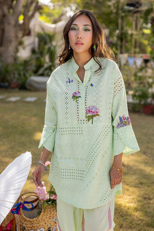 A pastel mint cotton eyelet tunic for those that crave the FH signature aesthetic, featuring whimsical embrodiery on the neckline and the most intricate, miniature hand embroidered garden on the sleeve! It Is paired with a cotton shalwar.