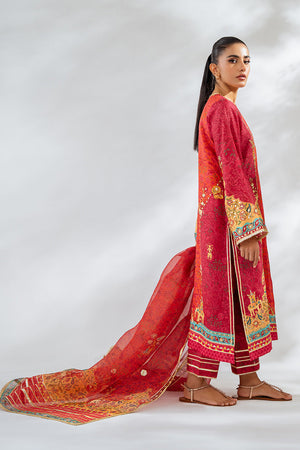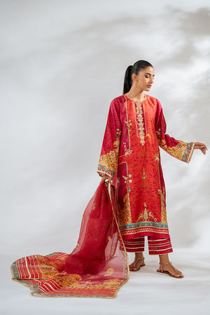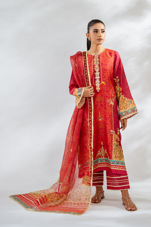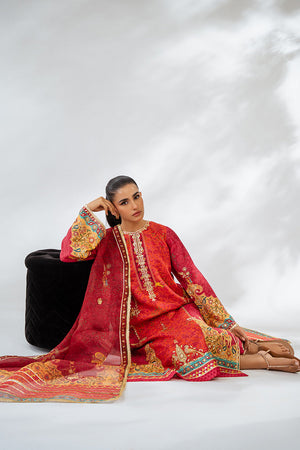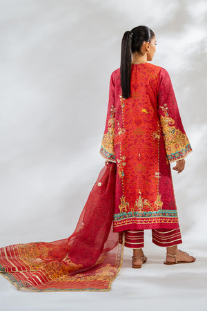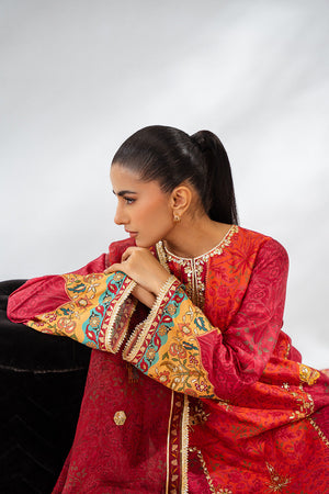 The vintage charm of a crimson hued a-line shirt and culottes will forever stay in vogue. Cut from the finest khaddi silk, the shirt has cherry accents and a floral print embellished with gota details and mughal figurines. The monochromatic print flows seamlessly onto pure raw silk culottes and an organza dupatta, adorned with shimmering gota embroidery that adds a festive sparkle to the ensemble.